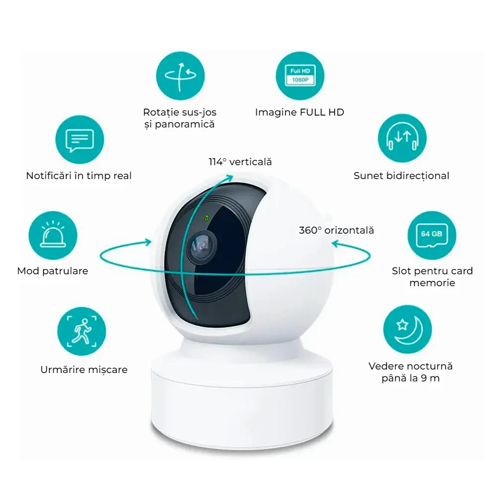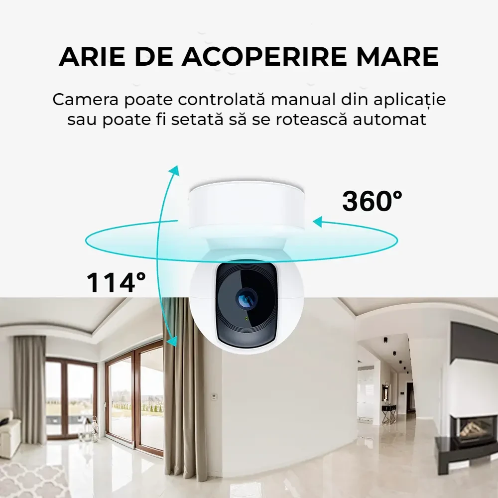 Explorarea tuturor coltisoarelor ale camerei tale și personalizarea supravegherii devin un joc de copil cu Patrol. Poate fi programata sa scaneze automat incaperea si sa trimita alerte de miscare sau poate fi controlata manual prin aplicatie. Are capacitatea de rotatie 360° pe orizontala si 114° pe verticala, asigurand o acoperire completa.
