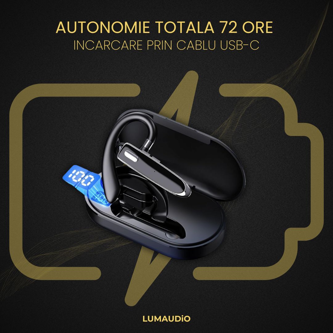 Cu o baterie de 120 mAh, casca bluetooth Lumaudio Ring oferă o autonomie de 10-12 ore, permițându-ți să te bucuri de muzică sau apeluri telefonice pentru o perioadă extinsă. Cutia de încărcare dispune de o baterie de 800 mAh, asigurându-ți până la 6-7 încărcări complete pentru casca bluetooth, ceea ce înseamnă o autonomie impresionantă de 70-72 ore în total. Încărcarea se face rapid printr-un port de tip USB-C, în 1.5 ore pentru cască și cutie. Astfel nu vei simți niciodată lipsa muzicii preferate.