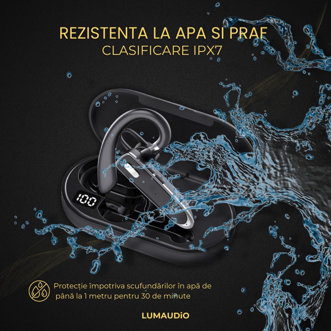Casca telefon bluetooth Lumaudio Ring are compatibilitate universala, asigurându-ți o experiență fără cusur indiferent de brandul pe care îl utilizezi. Indiferent dacă ai un telefon Samsung, iPhone, Huawei, Xiaomi, Oppo sau alt model popular, casca bluetooth Lumaudio Ring se va conecta ușor și rapid la dispozitivul tău. Cu certificarea IPX7, casca Bluetooth Lumaudio Ring este protejată împotriva scufundării în apă până la 1 metru adâncime pentru 30 de minute. Fii pregătit pentru orice aventură, de la antrenamente intense până la zile ploioase.