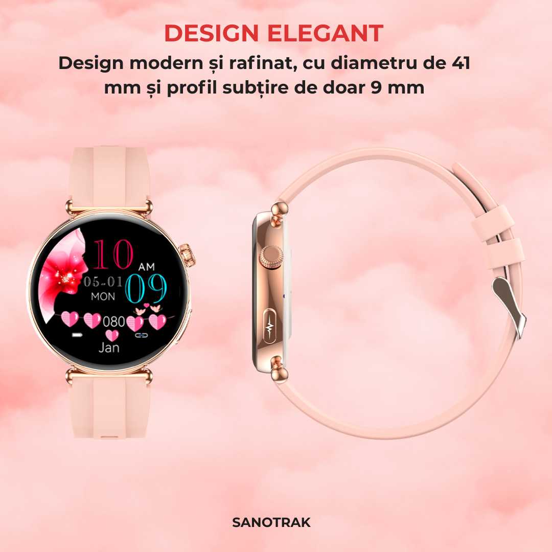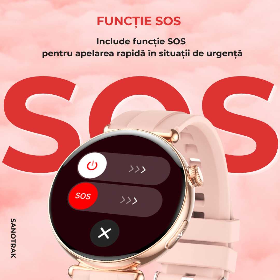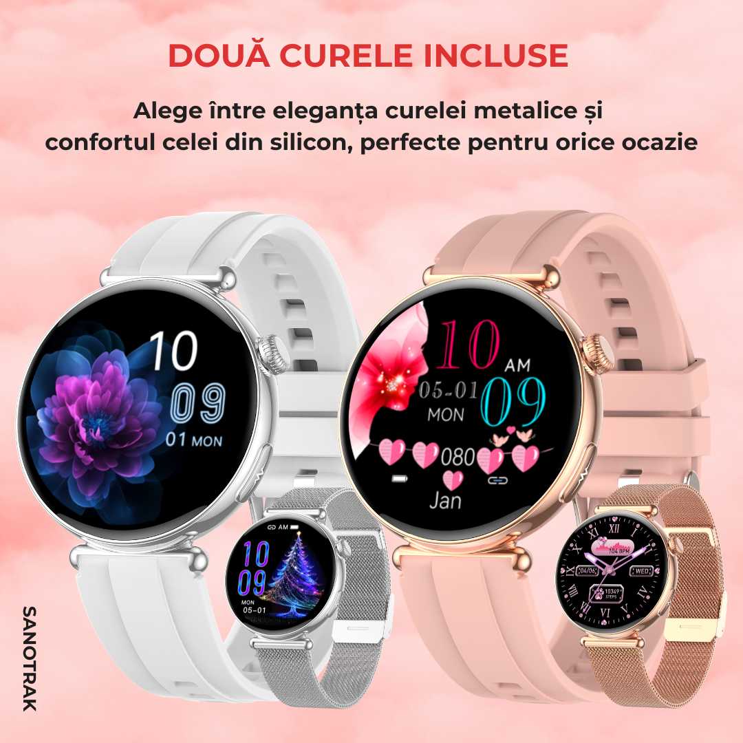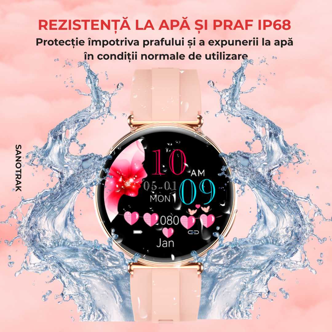 SANOTRAK Pulsara este un smartwatch creat special pentru femeile care își doresc mai mult decât un simplu ceas inteligent. Cu un design feminin și rafinat și două curele incluse – una metalică și una din piele – Pulsara îmbină eleganța cu funcționalitatea avansată. Ceasul este ușor, confortabil la încheietură și rezistent la apă (IP68), fiind potrivit pentru ploaie, spălat pe mâini sau antrenamente intense cu transpirație. Totuși, nu este recomandată utilizarea în timpul dușului sau înotului.