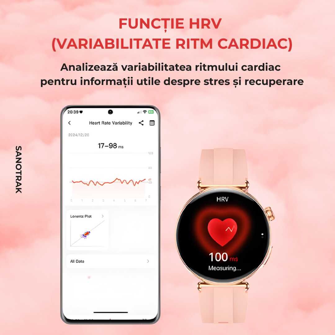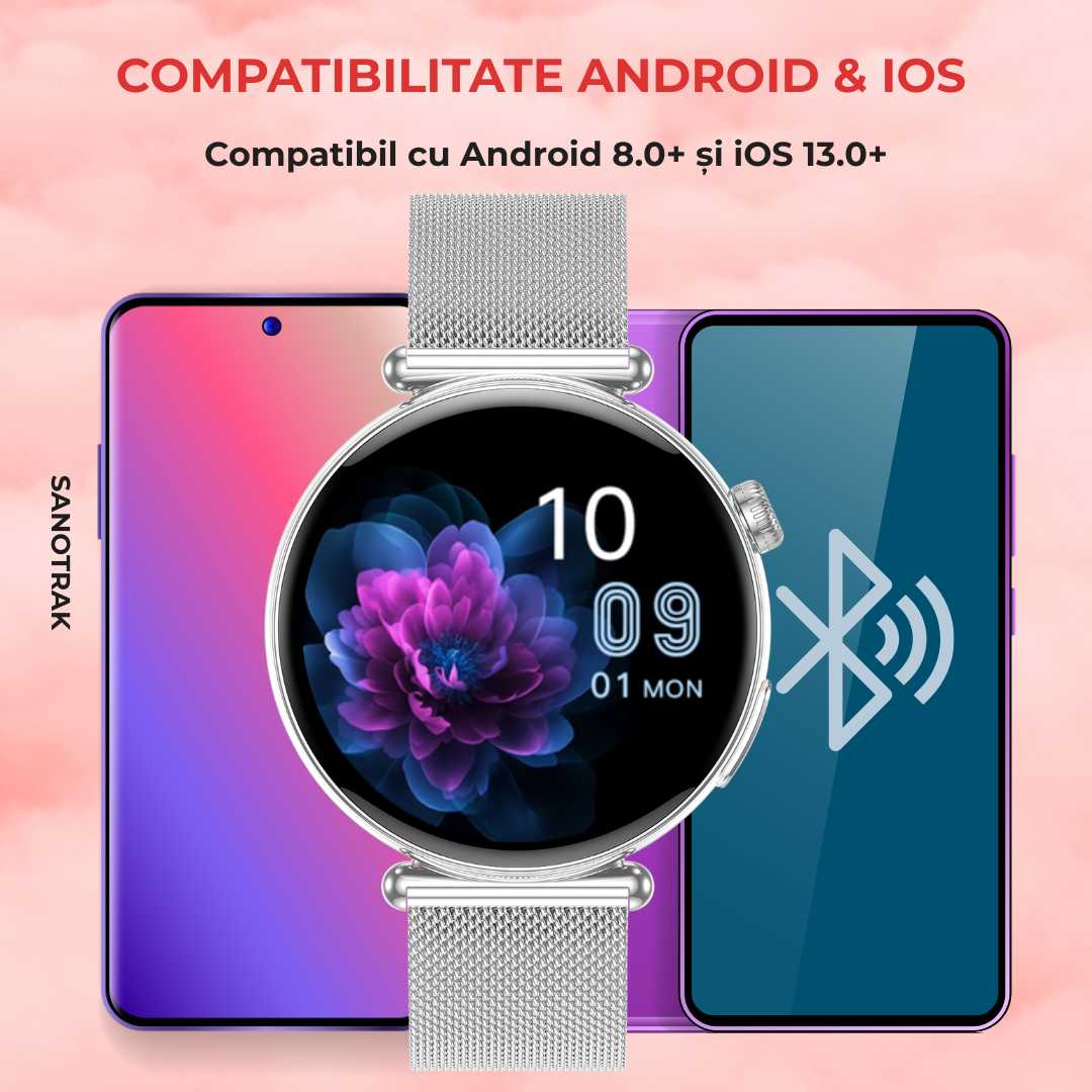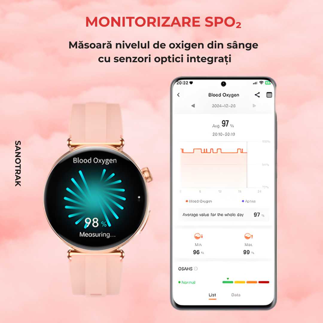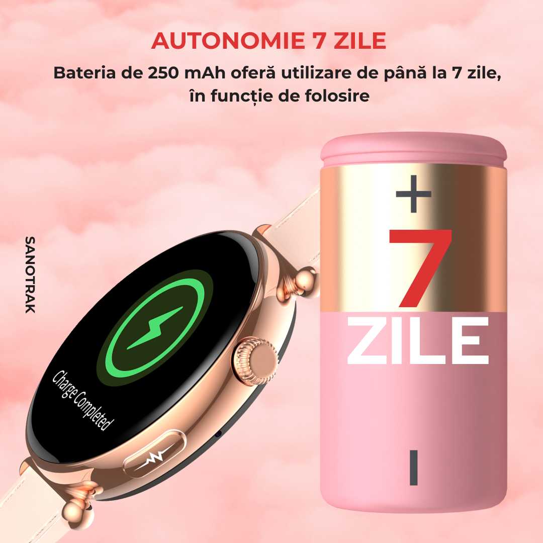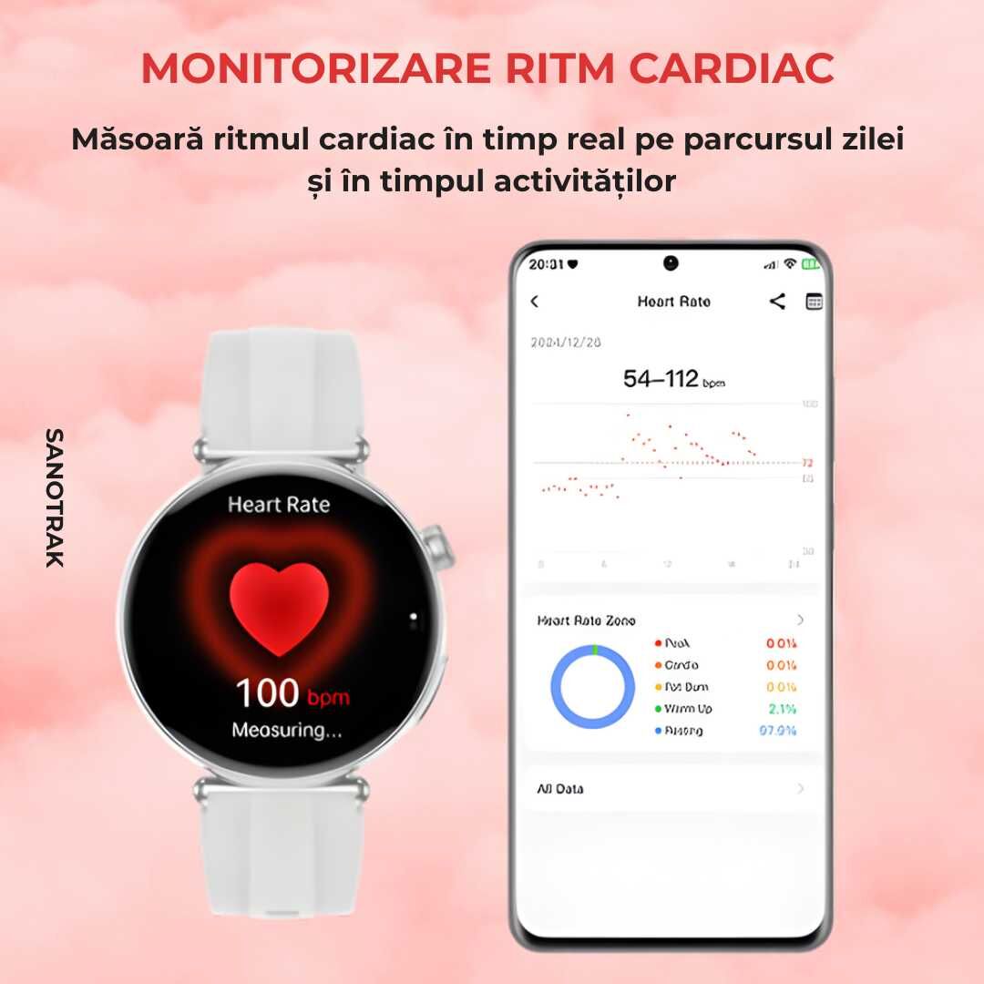 SANOTRAK Pulsara este un smartwatch creat special pentru femeile care își doresc mai mult decât un simplu ceas inteligent. Cu un design feminin și rafinat și două curele incluse – una metalică și una din piele – Pulsara îmbină eleganța cu funcționalitatea avansată. Ceasul este ușor, confortabil la încheietură și rezistent la apă (IP68), fiind potrivit pentru ploaie, spălat pe mâini sau antrenamente intense cu transpirație. Totuși, nu este recomandată utilizarea în timpul dușului sau înotului.