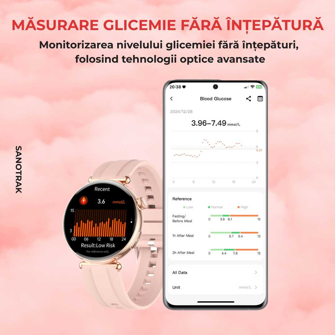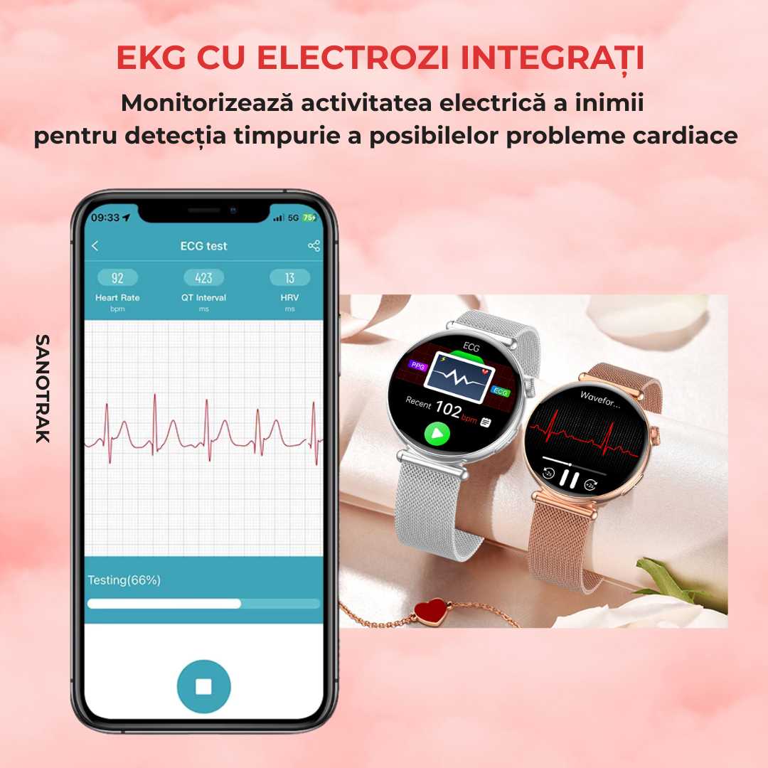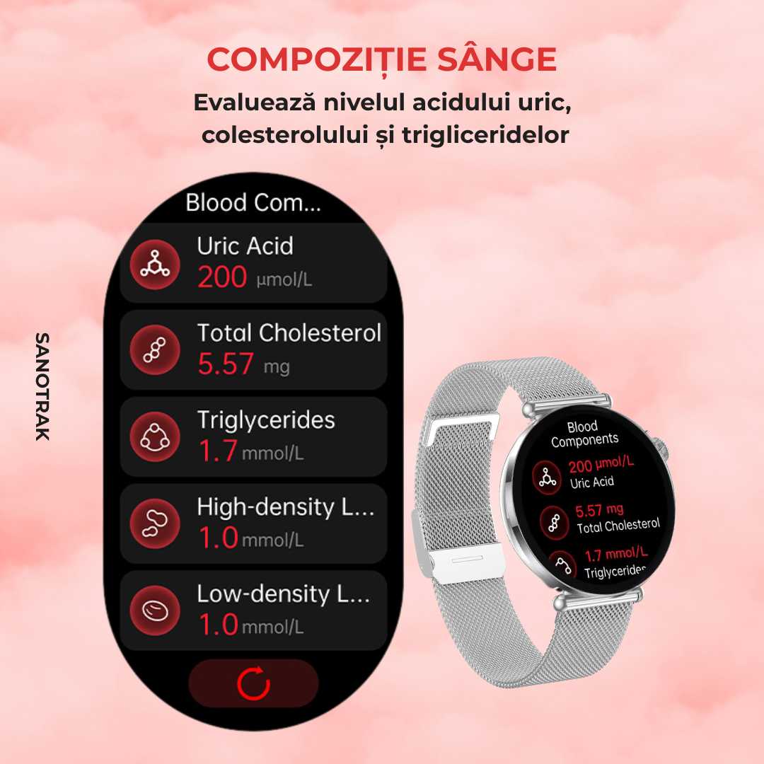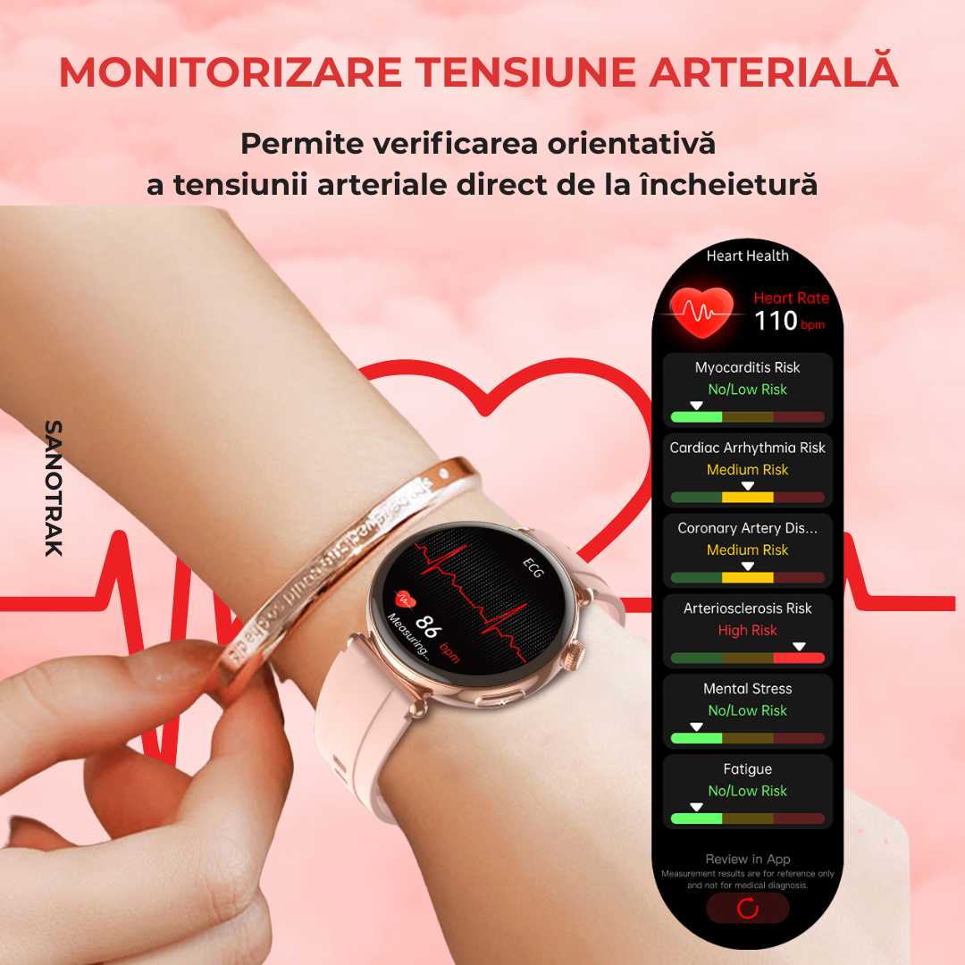 SANOTRAK Pulsara este un smartwatch conceput pentru cei care își doresc să îmbine tehnologia modernă cu monitorizarea inteligentă a sănătății și un design elegant. Acest ceas inteligent oferă acces rapid la funcții avansate de analiză a stării de sănătate, conectivitate permanentă cu telefonul și un stil rafinat potrivit pentru utilizarea zilnică.