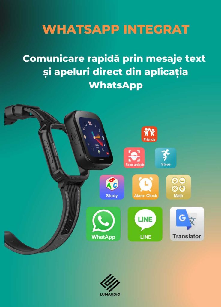 | alte-functii | Buton de urgenta, Control parental, Localizare GPS, Monitorizare puls, Pedometru, Apeluri video HD, Deblocare facială, Gard virtual, Inregistrator sunet, Istoric traseu, Joc matematic, Localizare GPS+AGPS+LBS+WIFI, Magazin de aplicatii, Mesaje vocale și text, Monitorizare la distanță (funcție spion), Player video, Slot cartelă nano SIM 4G LTE, WhatsApp integrat |